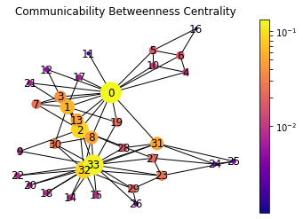 Betweenness CentralityとRandom Walk Betweenness Centralityの中間にあるような中心性.頂点$i$のCommunicability Betweennessは,頂点$p$から出発して頂点$q$で終了するRandom Walkがその途中で頂点$i$を通過する回数を全ての頂点対$(p, q)$とその経路長で加重平均したもの.