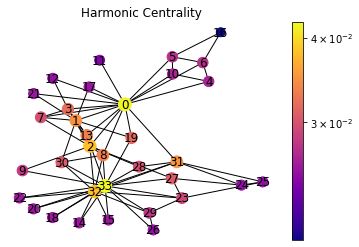 頂点$u$の調和中心性$x_u$はその他の頂点への最短経路長の逆数の和で定義される.