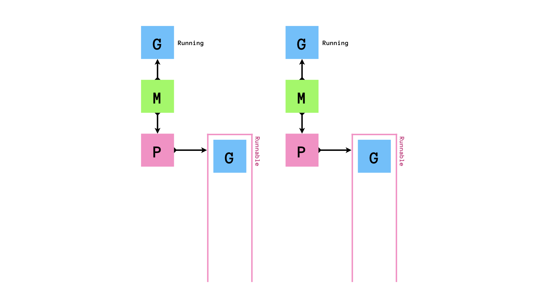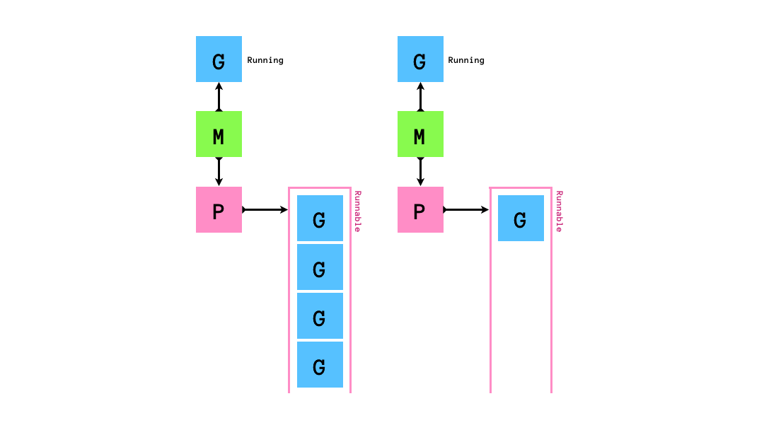 runnableなGがPにenqueueされ,MはPからrunnableなGを1個取り出して実行します.