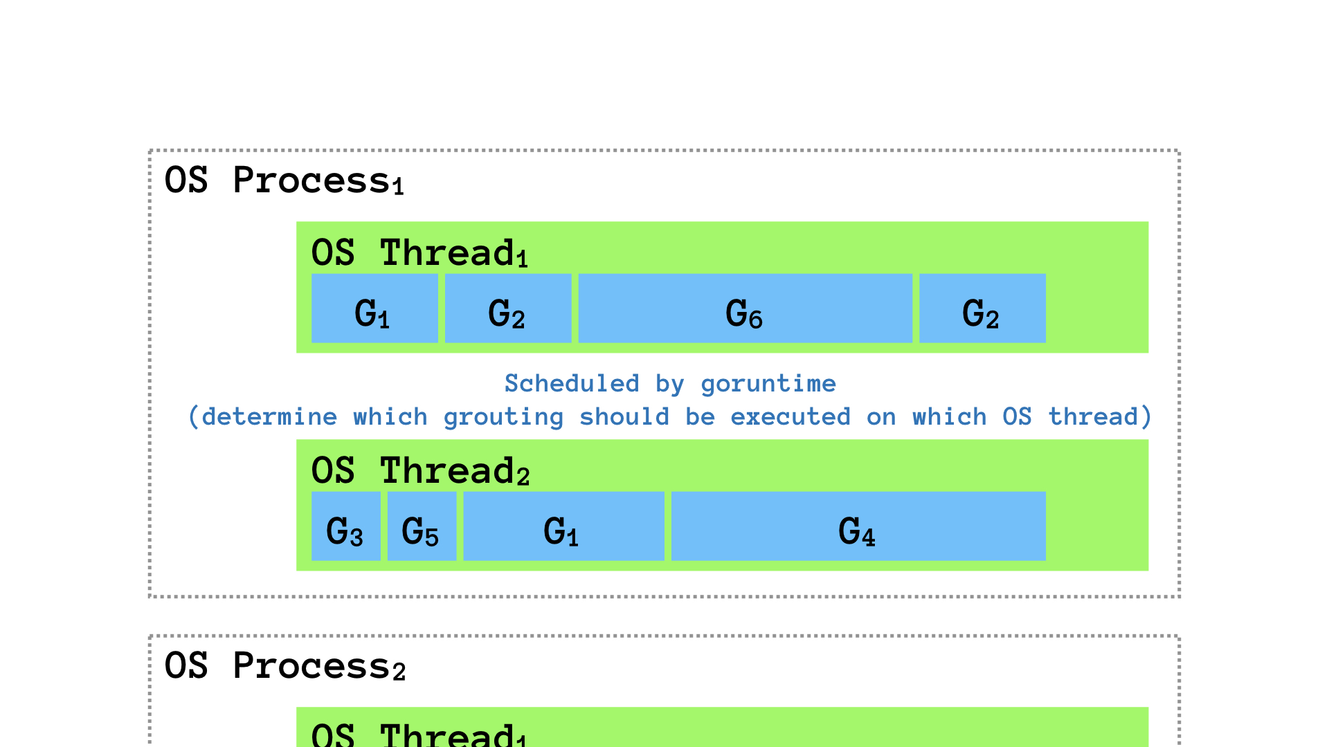 それは確かにそうなんですが,goroutineはOSの提供するプロセスとかスレッドと同レベルの存在ではなくて,goroutineは,OSの提供するスレッドに対してM:Nでマッピングされる「golangのruntimeが提供する,ユーザー空間で定義されたスレッド」として存在しています.golangのruntimeはgoroutineを管理していて「いつ,どのgoroutineを実行するか」を決定するschedulerとしての役割も担っています.つまりgolangのruntimeはユーザー空間で動く「ミニOS」のようなものな訳です.とは言いつつも,実際に実行されるためにはOSの提供するスレッドとして実行されなければいけないわけですから,goroutineはスレッドにマッピングされることになります.golangのschedulerはgoroutineとOSのスレッドを,M:Nでマッピングします.つまり複数のgoroutineが複数のOSスレッドとして実行されるわけです.1つのgoroutineが複数のOSスレッドとして実行されるし,1つのOSスレッドでは複数のgoroutineを実行することになります.