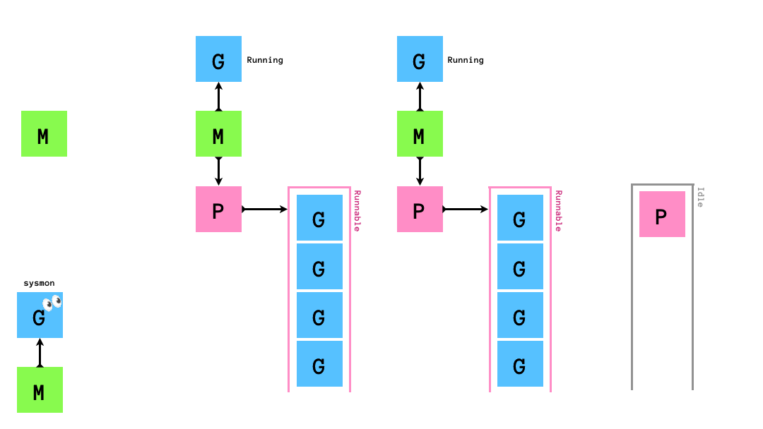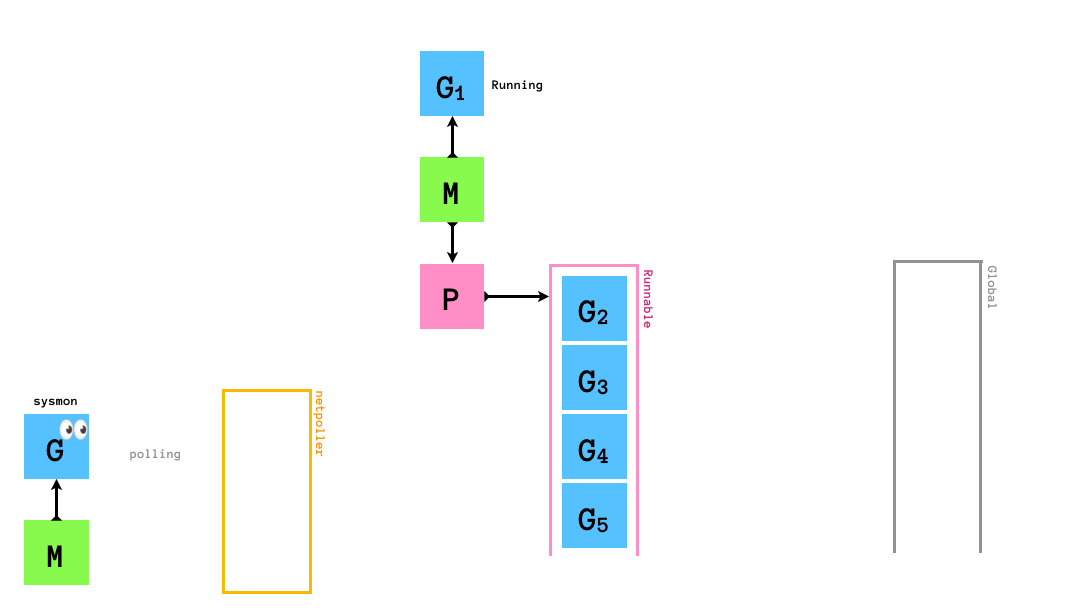 sysmonGOMAXPROCSの数だけのMとPの他に,sysmonという関数を実行し続ける特別なMが存在していますsysmonの実態は無限ループで,そのループの中でnetpollのチェックなどを行っています