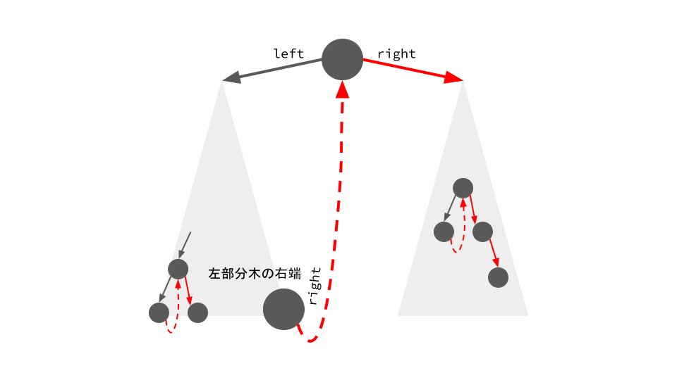 「左部分木の左端の葉ノードに到達するまでに間に,左部分木の右端葉ノードから通りがけ順で直後の頂点へのポインタを(右の子供として)張りながら木を降りていって,降りきれなくなったタイミングでひたすら右の子供をたどっていくと,通りがけ順になってる」というもの.