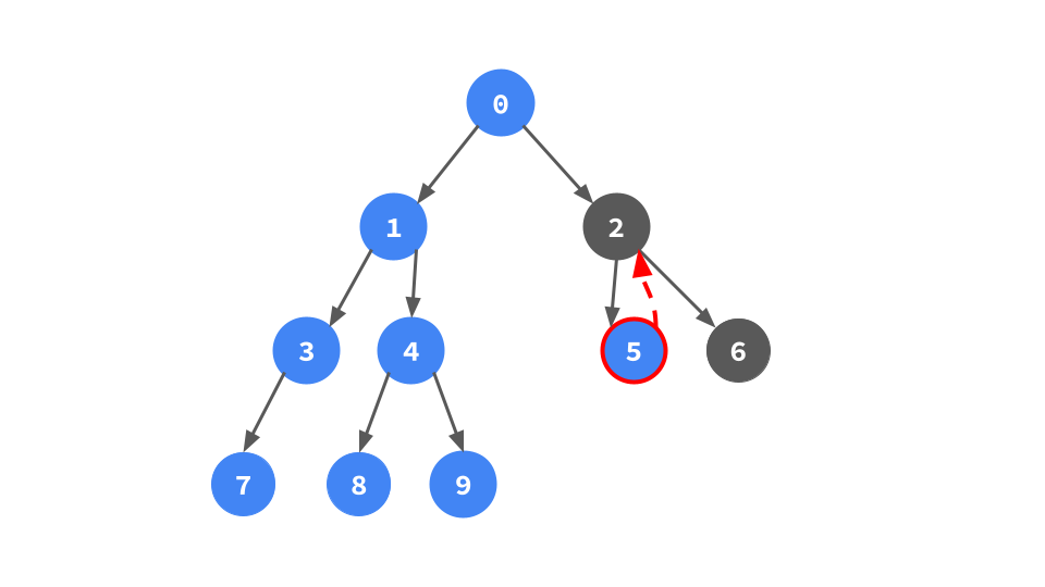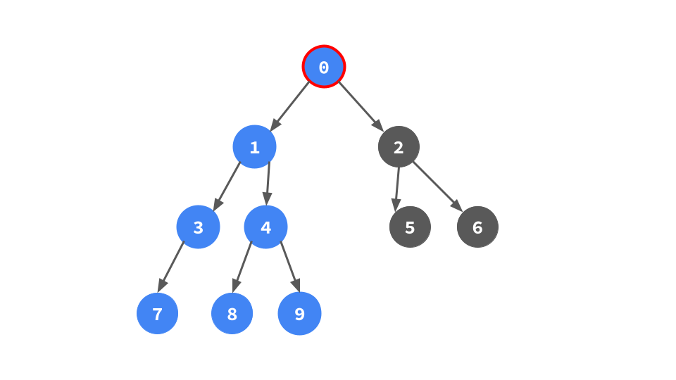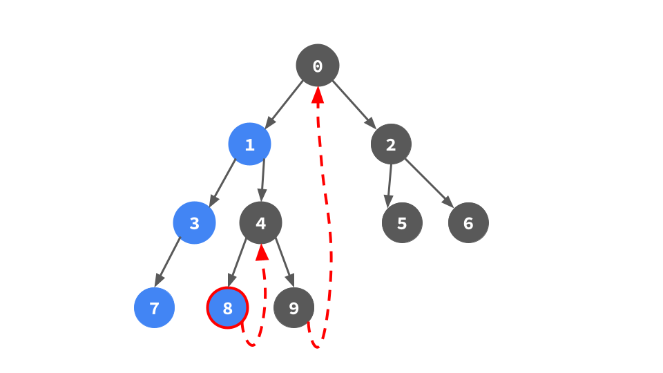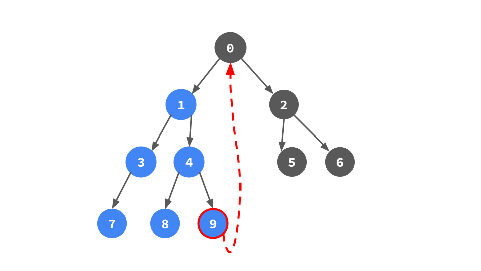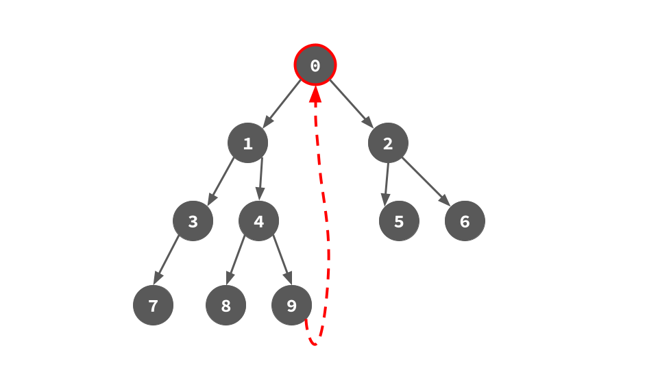 まず頂点0から走査を始める.0には左部分木があるので,0の左部分木の右端葉を計算すると今回は頂点9.9の右の子供として0へのポインタを張っておく.このポインタを後でたどることで行きがけ順を達成する.