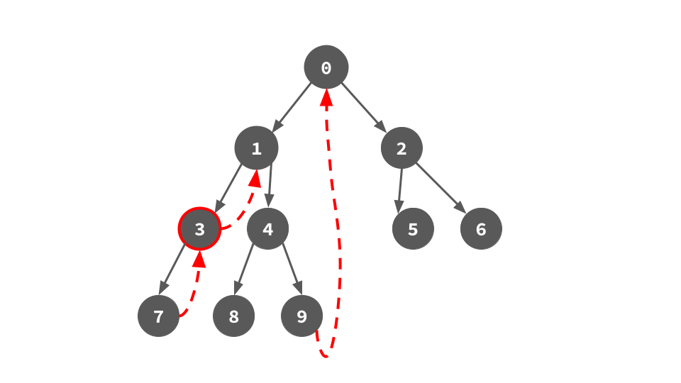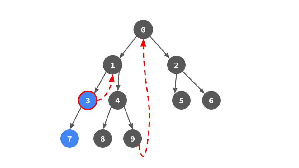 左部分機が存在しない,つまり左端の葉まで降りたら,そこが行きがけ順の一番最初の頂点なので処理をする.今回は頂点7がそれ.頂点7を処理したら,さっき張った7の右子ポインタを使って遷移する.このポインタは行きがけ順における左部分期の右端葉とその直後の頂点を結んでいるので正しく行きがけ順に遷移することになる.今回の例だと3へ赤いポインタを使って遷移することになる.このとき,遷移しながら赤いポインタを剥がす,具体的には7の右子ポインタにNoneをセットする.このアルゴリズムでは「ポインタを張りながら遷移して不要になったらすぐ剥がす」という挙動になっている.全部張ってから剥がすのではないという点に注意.